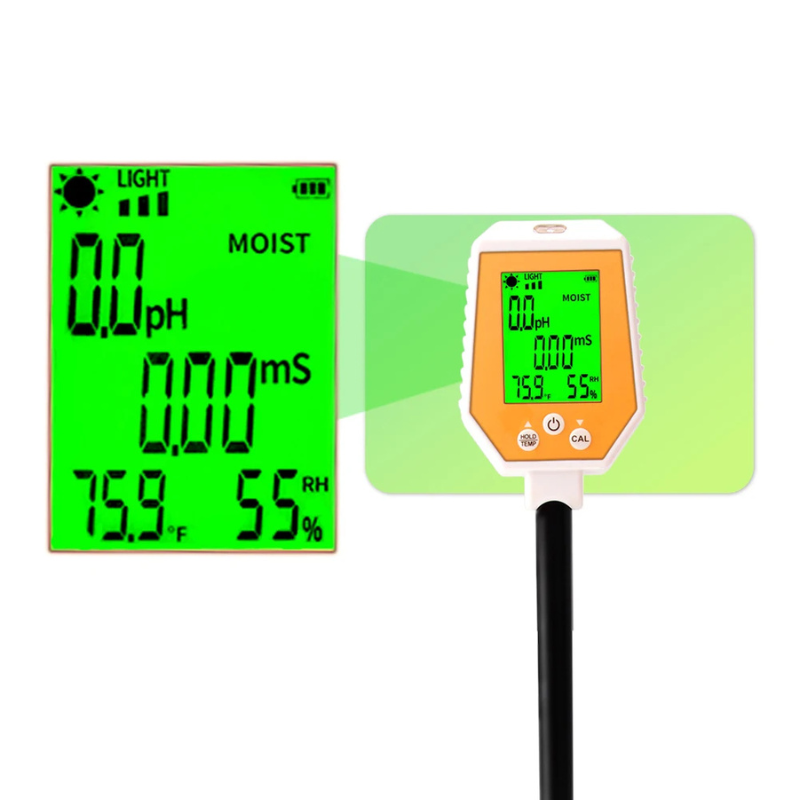 With our upgraded soil sensor , you can measure soil pH , electrical conductivity (EC) , soil moisture , light intensity , temperature , and humidity . This device gives you a comprehensive understanding of your soil, improving the accuracy of your gardening and ensuring optimal plant care . Keep your plants thriving with this moisture meter.