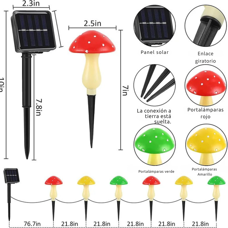 Dale un toque mágico a tu jardín o espacio exterior con nuestras 6 Luces Solares de Hongos. Estas lamparas solares con forma de hongo y 6 cabezales son perfectas para caminos de jardín, decoración navideña, Pascua y eventos al aire libre.
