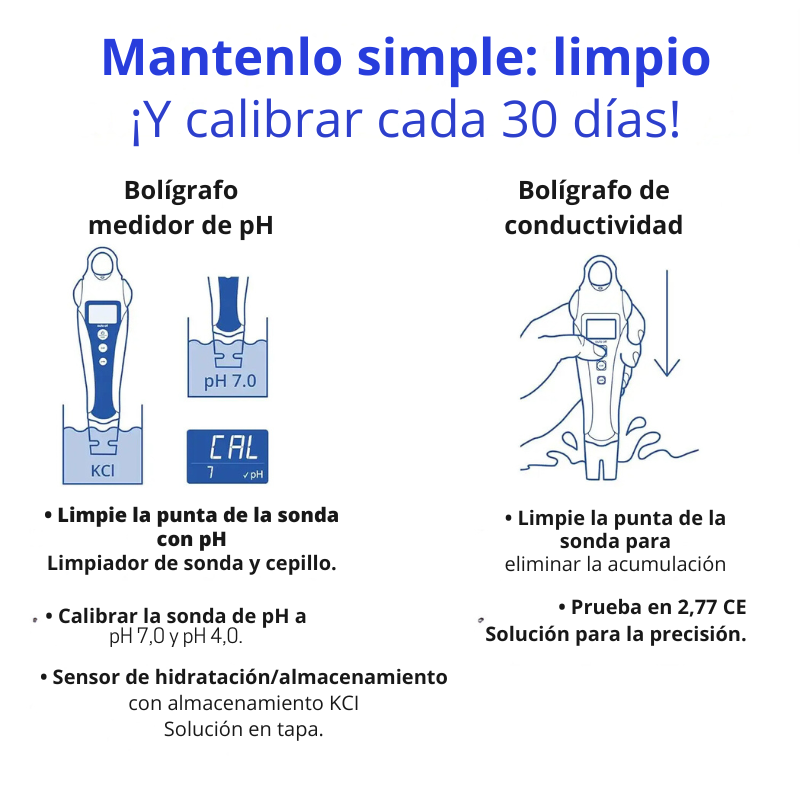 Bolígrafo de pH: Con una precisión de 0,1 pH, este bolígrafo es fácil de calibrar gracias a su proceso de calibración de dos puntos. Incluye sobres de referencia para asegurar la entrega precisa de nutrientes a tus plantas.